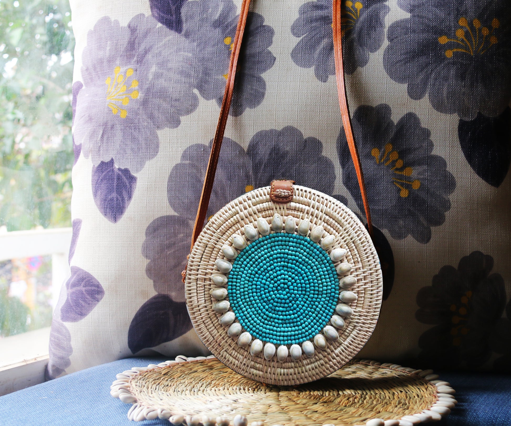 Handmade bag from Ratan plants, cover with stone, 100% leather solder. Pants based , 100% natural color . Hand crafted from Cambodian Women village community, please help support their living.